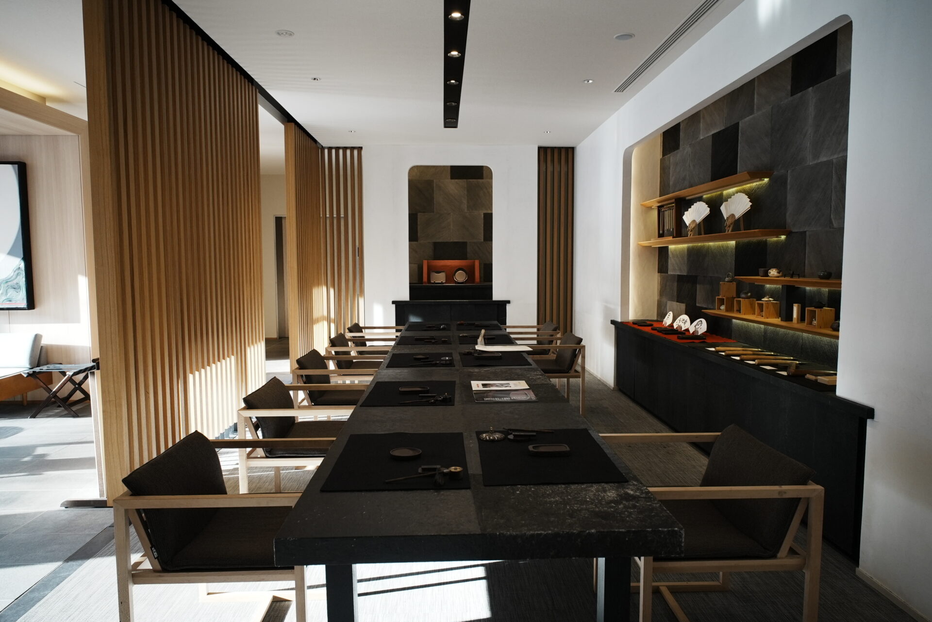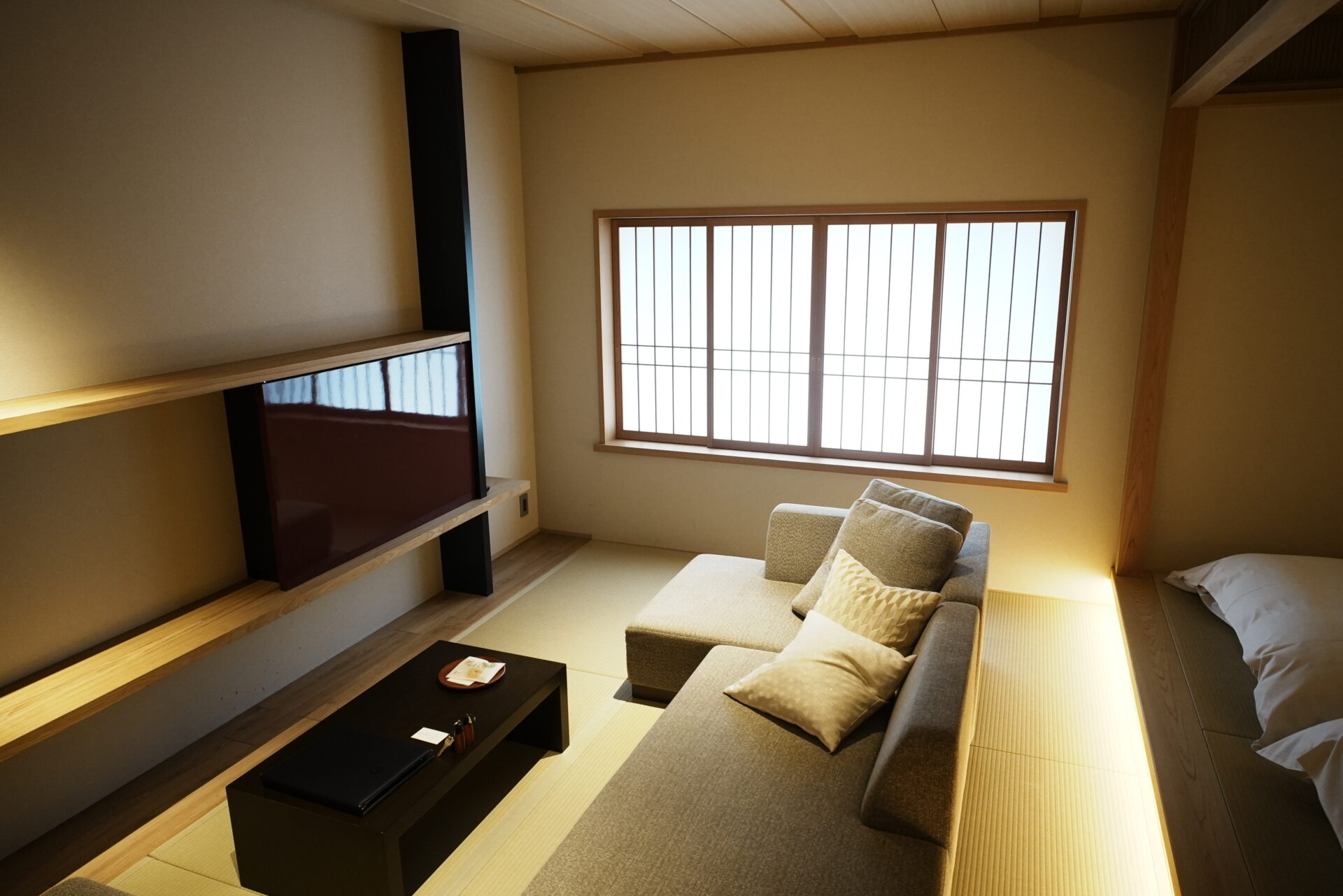 写真左中央の板を左にスライドするとテレビが隠れています。テレビがあると生活感がでてしまうので、見えなくすることは雰囲気を上げてくれます。