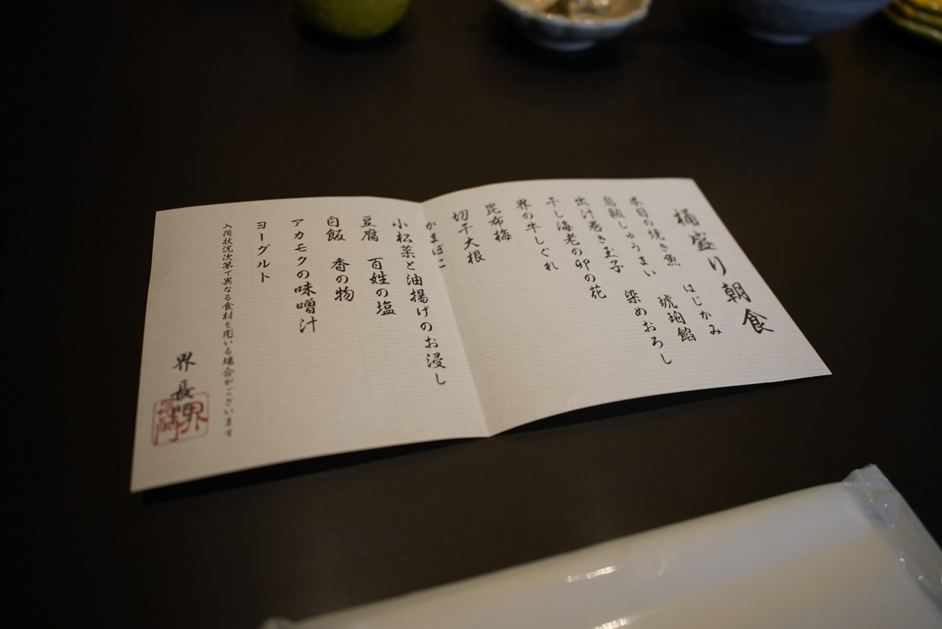 朝は、桶盛り朝食。柚子胡椒で味変ができる味噌汁が美味しかったです。ご飯のお供もたくさん。
